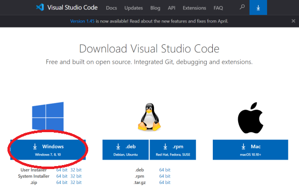 Visual Studio Code の Download ページ の Windows 用のリンクをクリックしてインストーラをダウンロードします。