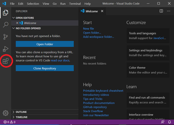 Visual Studio Code を起動して、ウィンドウの左下にある「Extensions」ボタンを クリックして、「Extensions Marketplace」を表示します。