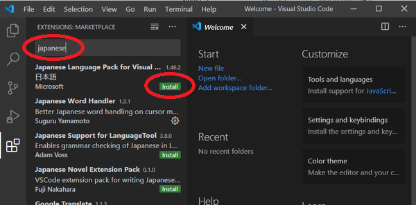 これで Visual Studio Code 自体のインストールは完了ですが、 Visual Studio Code のメニューの文字などを日本語にしたい場合は、 さらに、以下のように 「Japanse Language Pack for Visual Studio Code をインストールしてください。
